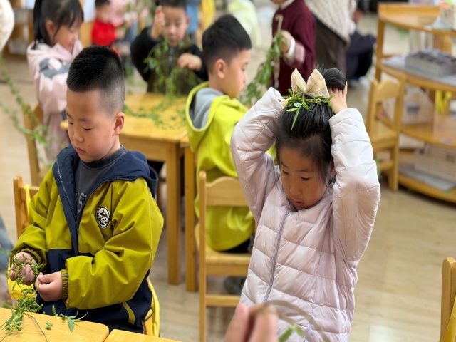 各班根据幼儿年龄特点,开展了丰富多彩的特色民俗活动。小班幼儿巧手制作会动的青团、创意柳叶手环,亲手播下种子,在动手操作与种植实践中知晓清明习俗,感受生命成长;中班幼儿编织柳条帽、制作纸菊寄托思念,用黏土创意捏制青团,沉浸式体验戴柳、食青团等传统民俗;大班幼儿则开展清明诗会、绘制春日画卷,收集花草制作植物拓印,分组进行蹴鞠游戏,在诗词诵读、艺术创作与传统游戏中领略清明文化魅力。