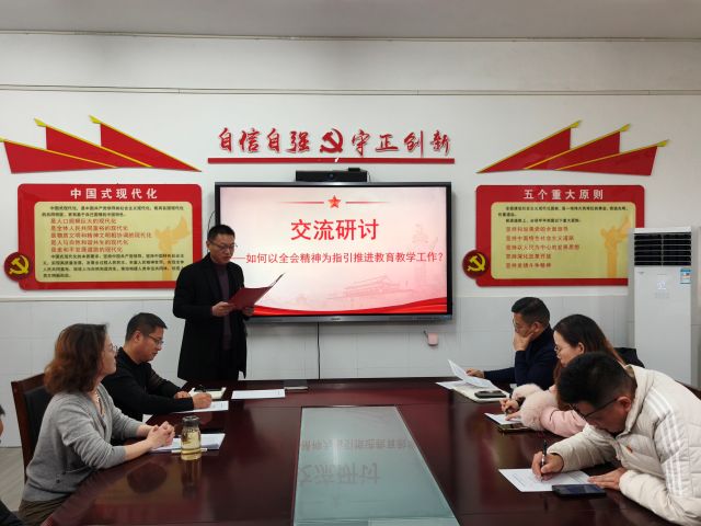 随后,在交流研讨环节,围绕“如何以全会精神为指引推进教育教学改革”这一核心主题,党员教师们结合自身教学实践踊跃发言。余兆兵同志提出,要立足“立德树人”根本任务,将社会主义核心价值观融入教育教学全过程,培养担当民族复兴大任的时代新人。王宏军同志表示,要主动对标全会提出的高质量发展要求,不断加强自身专业素养提升,在教育科研、家校共育等方面积极探索,为打造优质教育资源贡献力量。现场讨论氛围热烈,凝聚起“以学促干、以干践学”的思想共识。