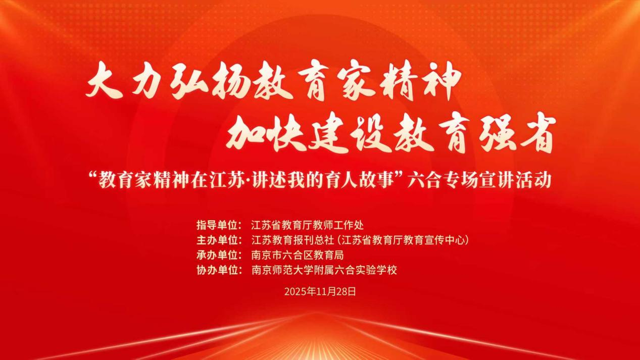 11月28日下午,由省教育厅教师工作处指导、江苏省教育厅教育宣传中心(江苏教育报刊总社)主办的“教育家精神在江苏·讲述我的育人故事”宣讲活动在南京市六合区举行。三位江苏教师代表讲述了他们坚守乡村教育、奉献特教事业和支援西部教育的感人故事,六合区200多名中小学教师代表现场聆听,省教育厅教师工作处二级调研员许李军,省教育厅教育宣传中心主任赵建春,六合区政协副主席、区教育局局长张弛、区委教育工委书记陈旭东出席活动,江苏教育报刊总社副总编辑陈瑞昌主持活动。