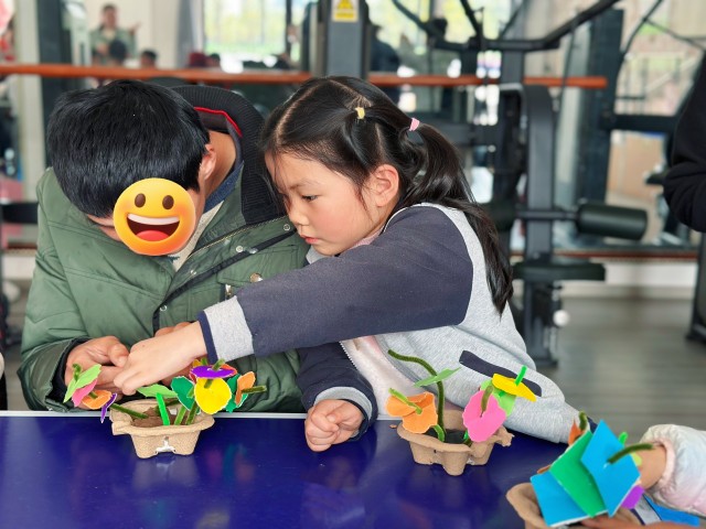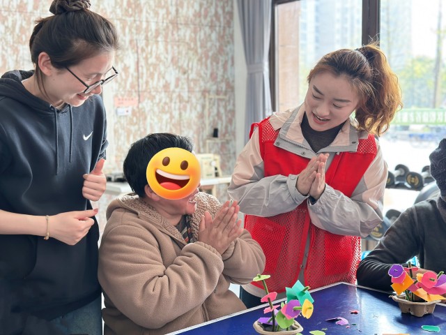 活动伊始,教师为在场幼儿及“残疾人之家”的成员进行了自闭症科普讲解,帮助大家理解什么是自闭症、如何与身边的特殊朋友相处。随后,老师和幼儿代表共同献唱歌曲《送你一朵小红花》,清澈的童声与温暖的旋律交织在一起,传递出理解、鼓励与祝福。正值春暖花开之际,活动的最后一个环节是手工制作“春天的盆栽”。在老师的帮助下,幼儿和“残疾人之家”的朋友们结对合作,共同做出饱含祝福与希望的盆栽,希望这份春日礼物能让“残疾人之家”的朋友们感受到温暖与陪伴。