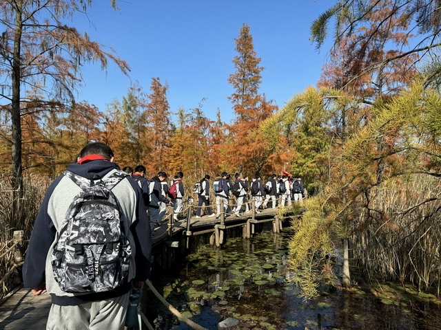在程桥池杉湖湿地公园,同学们开展了丰富多彩的团建活动,培养大家的团队意识,凝聚班级活力。随后,在老师带领下,同学们漫步于湿地栈道,深入湿地腹地,成片的池杉笔直挺拔,扎根水中、枝叶相连,大家认真观察独特的池杉林生态系统,认识水生植物与栖息鸟类,近距离感受湿地生物多样性的魅力,沉浸式体会自然环境的珍贵与美好。