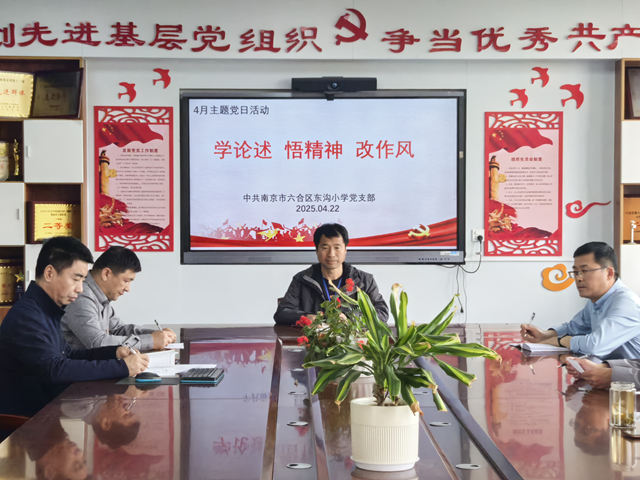 2025 年 4 月 22 日,六合区东沟小学党支部在党员活动室开展了以“学论述 悟精神 改作风”为主题的党日活动。