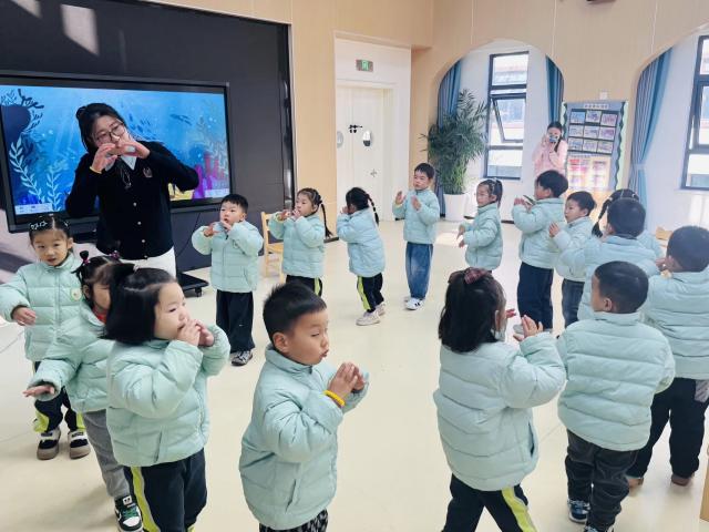 紧接着,三节精彩的音乐集体教学活动依次展开。龙瑞路幼儿园沙晨晨老师带来中班韵律活动《小飞鱼寻宝记》。她以“寻宝”为游戏情境,引导幼儿在模仿小鱼游、躲避障碍、探寻宝藏的过程中,自然感知音乐的快慢与强弱变化。孩子们以灵动的肢体语言诠释对音乐的理解,既展现了中班幼儿活泼好动、乐于探索的年龄特质,也凸显了教师扎实的活动设计能力与现场引导功底。