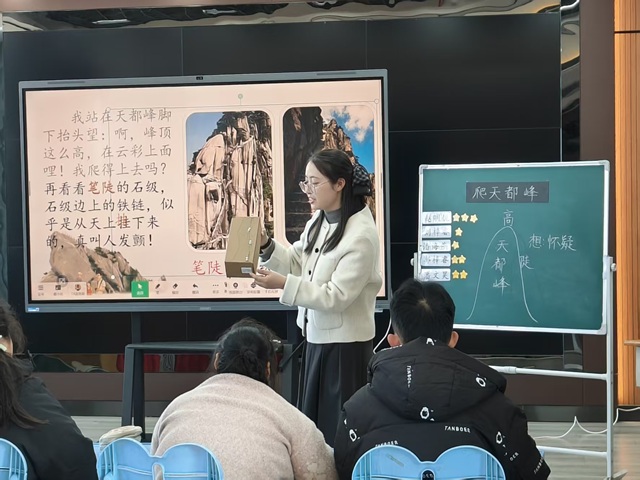 赵华萍老师执教了生活语文《爬天都峰》,她以“爬山”生活经验为切入点,借助AI数字人“天天”创设情境,引导学生理解课文内容。课堂聚焦关键词语、句段的理解与朗读,通过“看—想—说”的递进式教学,帮助学生体会人物心理变化和相互鼓励的情感。分层目标与任务单结合,兼顾不同表达能力学生的学习需求,注重价值观的渗透与表达能力的培养。