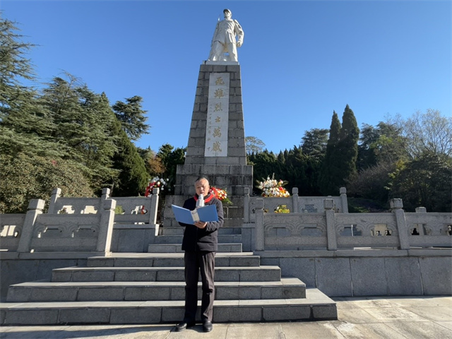 在桂子山烈士陵园,全体师生整理衣容,面向烈士纪念碑,全体肃立!两名少先队员代表向烈士纪念碑敬献花篮,寄托对革命先烈的深切缅怀。全体师生默哀三分钟,向革命烈士致以最沉痛的悼念。默哀毕,少先队队员代表宋亦欣发言,表达心中的崇敬与感悟。党支部书记陈朝玉同志发言,希望全体少先队员们传承先烈遗志,勇担时代使命。随后队员们依次有序瞻仰烈士纪念碑,感受革命先辈的崇高气节,将这份红色记忆与爱国情怀深深镌刻在心中。